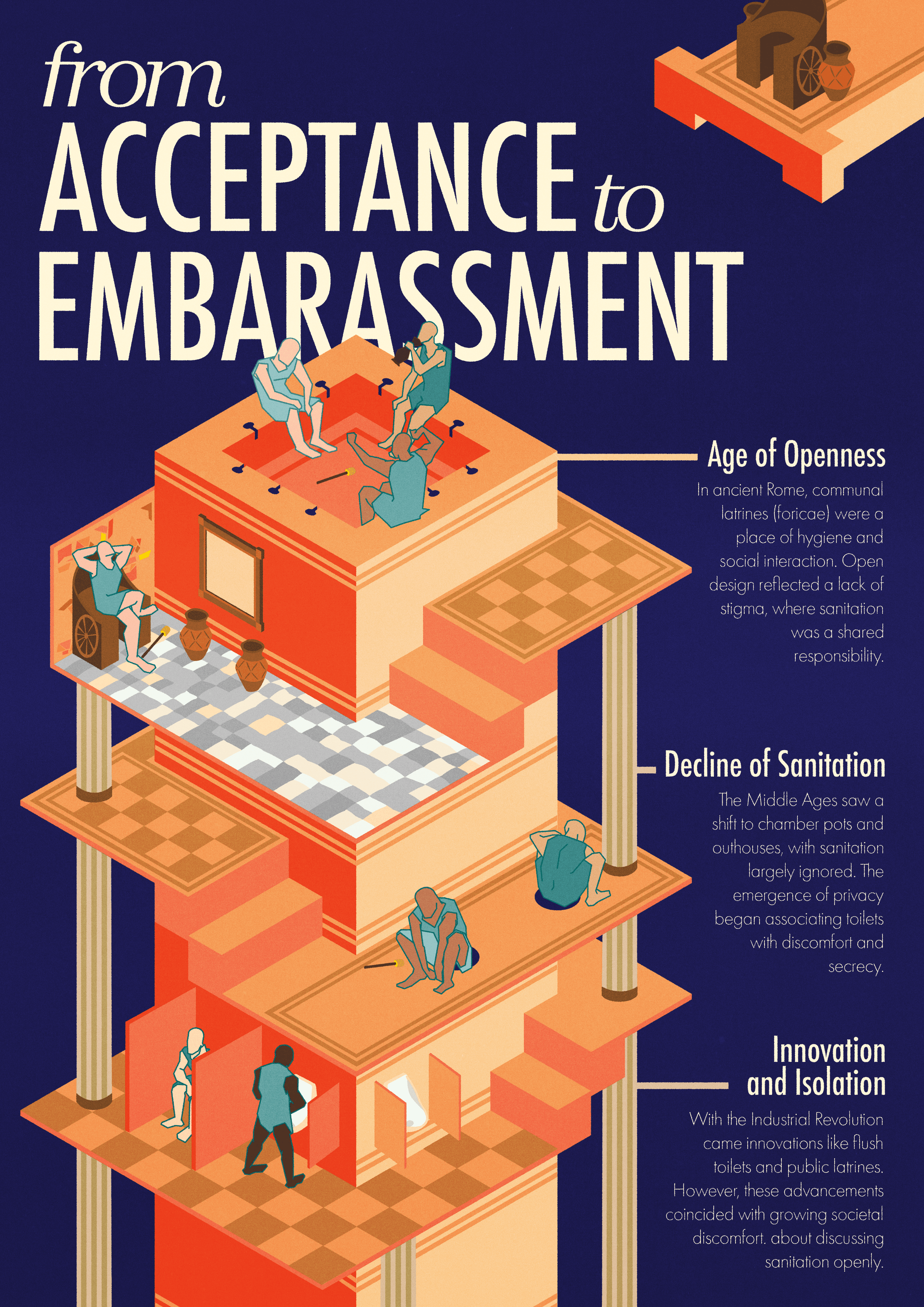 The ancient Roman Empire had public bathrooms installed, called foricae. Civilisation at that time was not embarrassed about fulfilling their bodily needs. The need to excrete was seen as an opportunity to socialise in the public bathrooms/communal baths. Increase in privacy concern led to more private latrines, which led to the slow change in the thinking of society. The act of defecation became a social stigma and taboo, one that people prefer not to mention out loud.